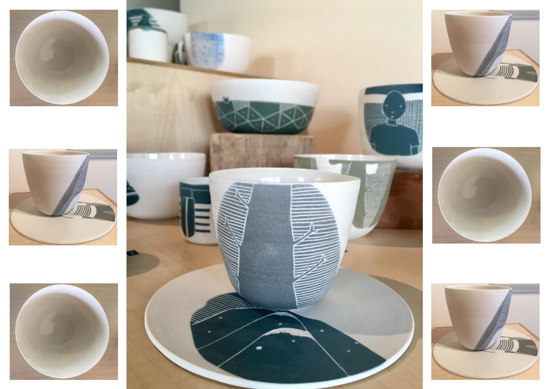 Vient ensuite la recherche des engobes qui sont un mélange de porcelaine et d’oxydes, c’est ainsi qu’elle fabrique ses couleurs, en essayant d’obtenir une variation harmonieuse de bleus, verts et de gris. Après avoir trempé une partie de ses pièces dans cet engobe, elle travaille sur le motif. Le dessin fait partie intégrante de son travail. Elle dessine depuis toujours et travaille la porcelaine comme un carnet à dessins en gravant l’engobe sur la terre crue. Elle réalise les graphismes sur le vif et sans ébauche suivant la forme aléatoire du tracé de l’engobe. Les formes ne sont pas définies à l’avance, elle sait où elle commence mais ne sais pas où elle va s’arrêter.