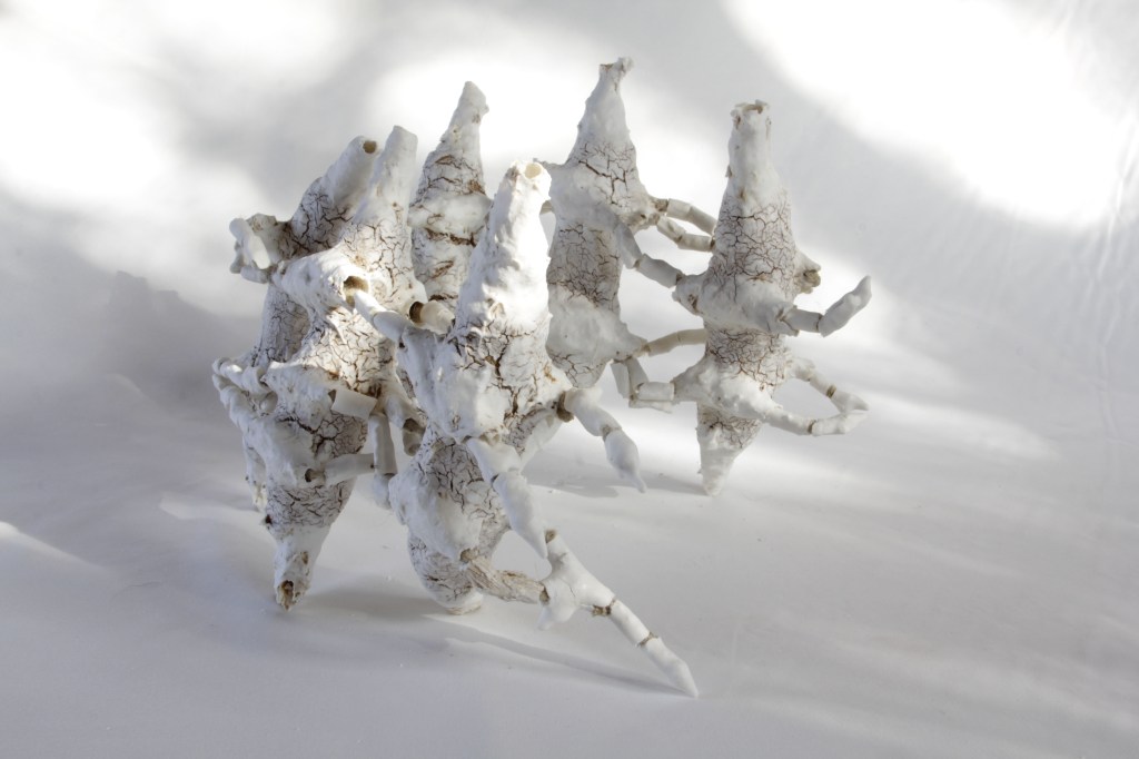 De ses associations poétiques des matières et des savoir-faire, les objets prennent forme : sculptures, mangeoires, théières…