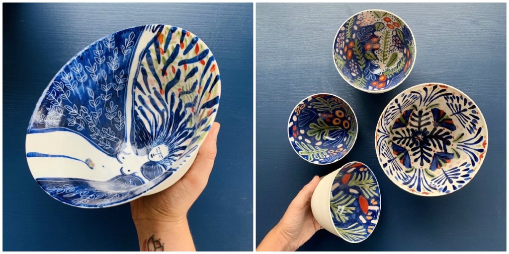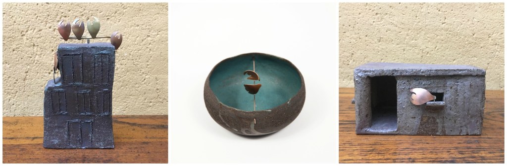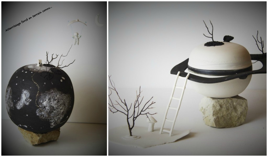 Elle travaille le grès, la porcelaine et fabrique ses émaux à partir de matières premières, en suivant à la lettre les recettes échangées, essayées, et quelques fois en fermant les yeux pour plus de surprises…