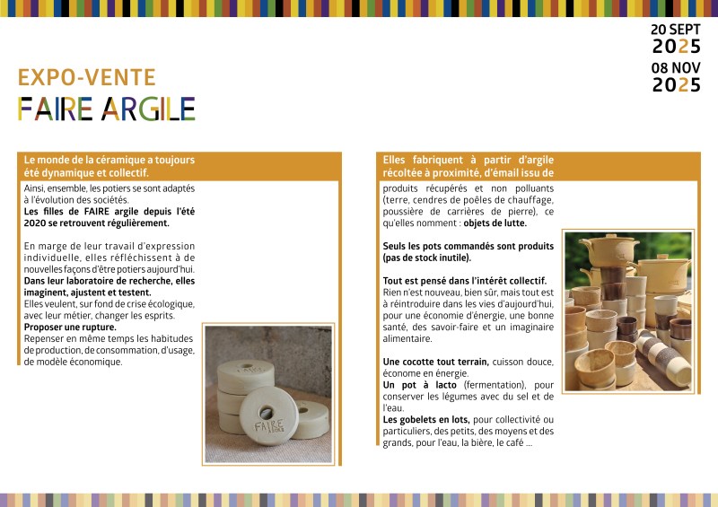 «Faire Argile», collectif de potières, célèbre ce savoir-faire avec une sélection de pièces qui vous fera découvrir les vertus gustatives de la céramique, où art, utilité et respect de l’environnement se conjuguent.