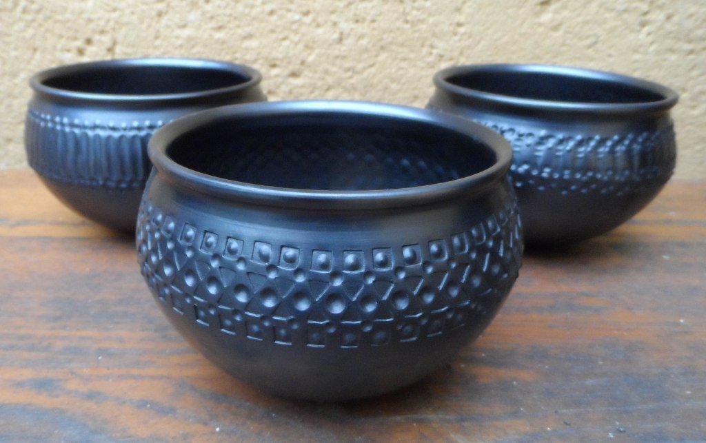 Caroline est créatrice céramiste, elle réalise toute une gamme de poterie tournées, engobées, polies et enfin creusées ou repoussées pour faire apparaître de petits carreaux sur un fond chocolat.