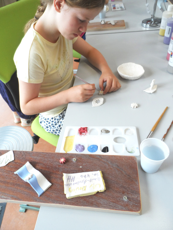 Les animations au Patiau continuent tout l’été ! Ce matin les enfants ont décoré des pièces qu’ils avaient précédement créées lors de l’animation « Petite dînette en terre ».