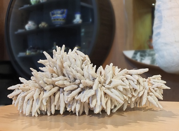 Ces lumineuses créations révèlent un bestiaire extraordinaire, entre le minéral et l’aquatique, l’osseux et le corail, placés aux confins de la vie, entre les espèces et les éléments. Celles -ci font appel à une mémoire enfouie commune aux êtres vivants… ( Extrait et adaptation du texte de Margot Reault-Bouron, 2019, exposition « Entre deux eaux »)