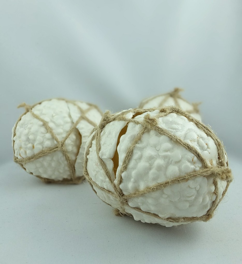 Une biosphère de porcelaine et de lien végétal se compose alors et les pièces résonnent ensemble par la récurrence de certains motifs. Chacune dispose de son-chant propre, de son identité propre, le tissage en chanvre paraîssant donner vie à des organismes modulables.