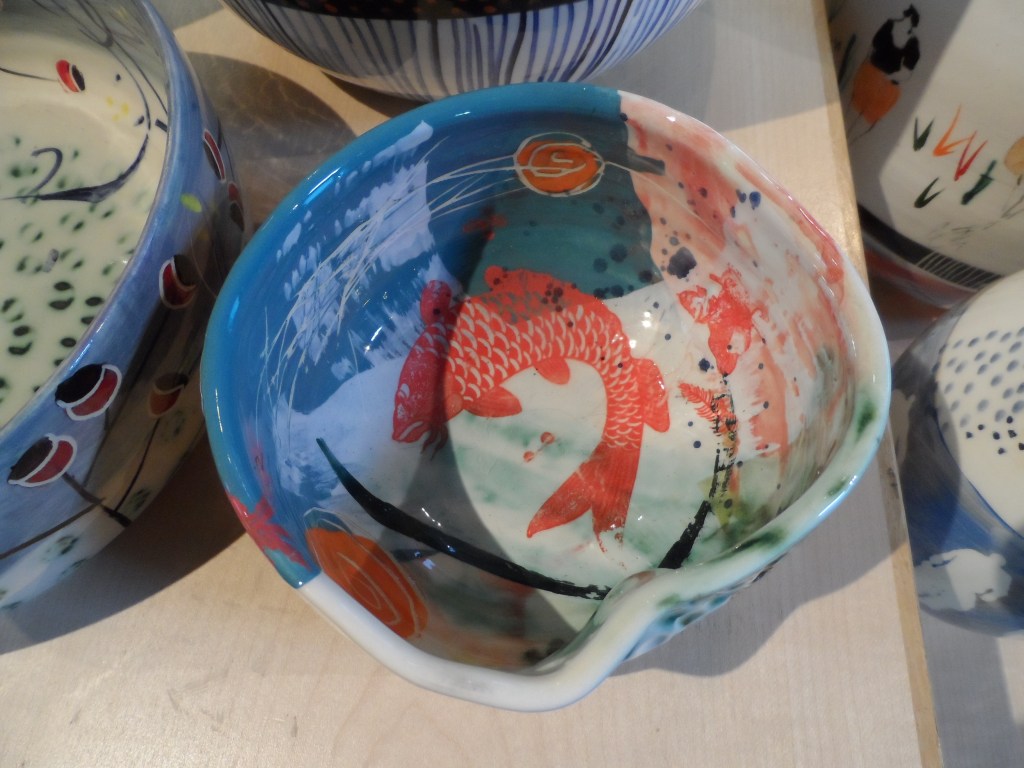 C’est tout naturellement que son univers graphique vient se poser sur les objets utilitaires, tantôt tournés, tantôt fabriqués à la plaque. Les couleurs se mêlent et se posent sur la faïence, nous emmènent en voyage, en bord de mer ou encore nous font prendre l’avion…